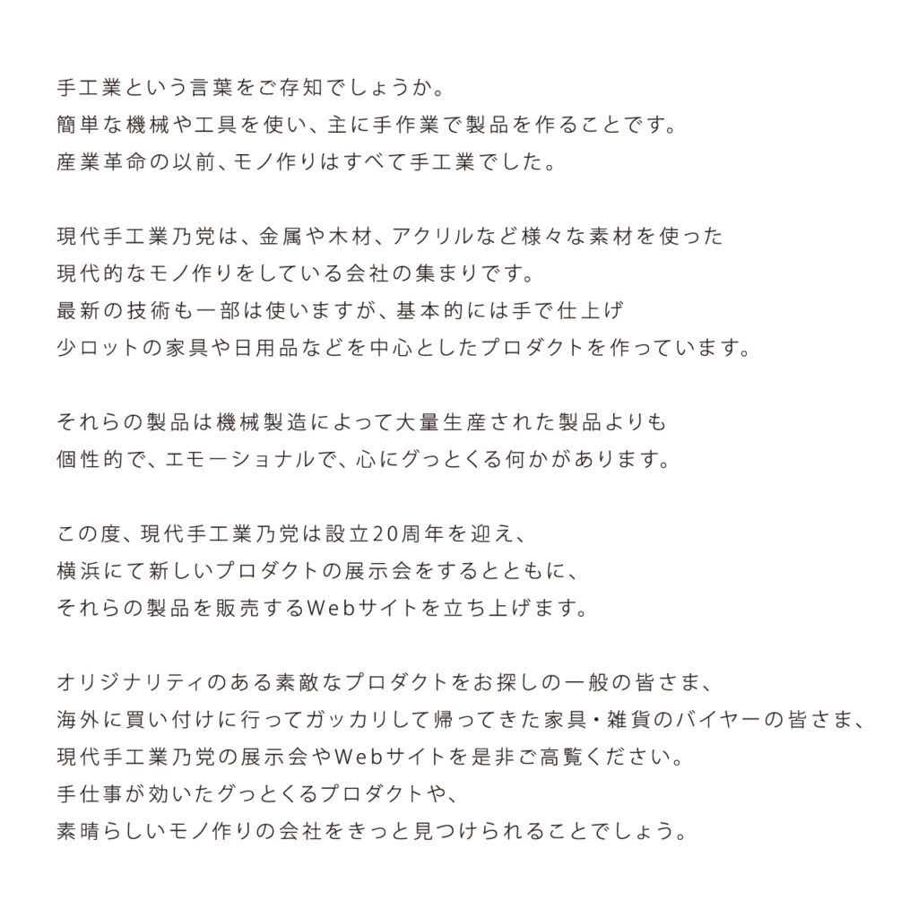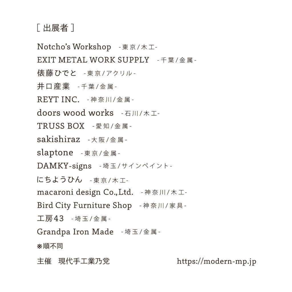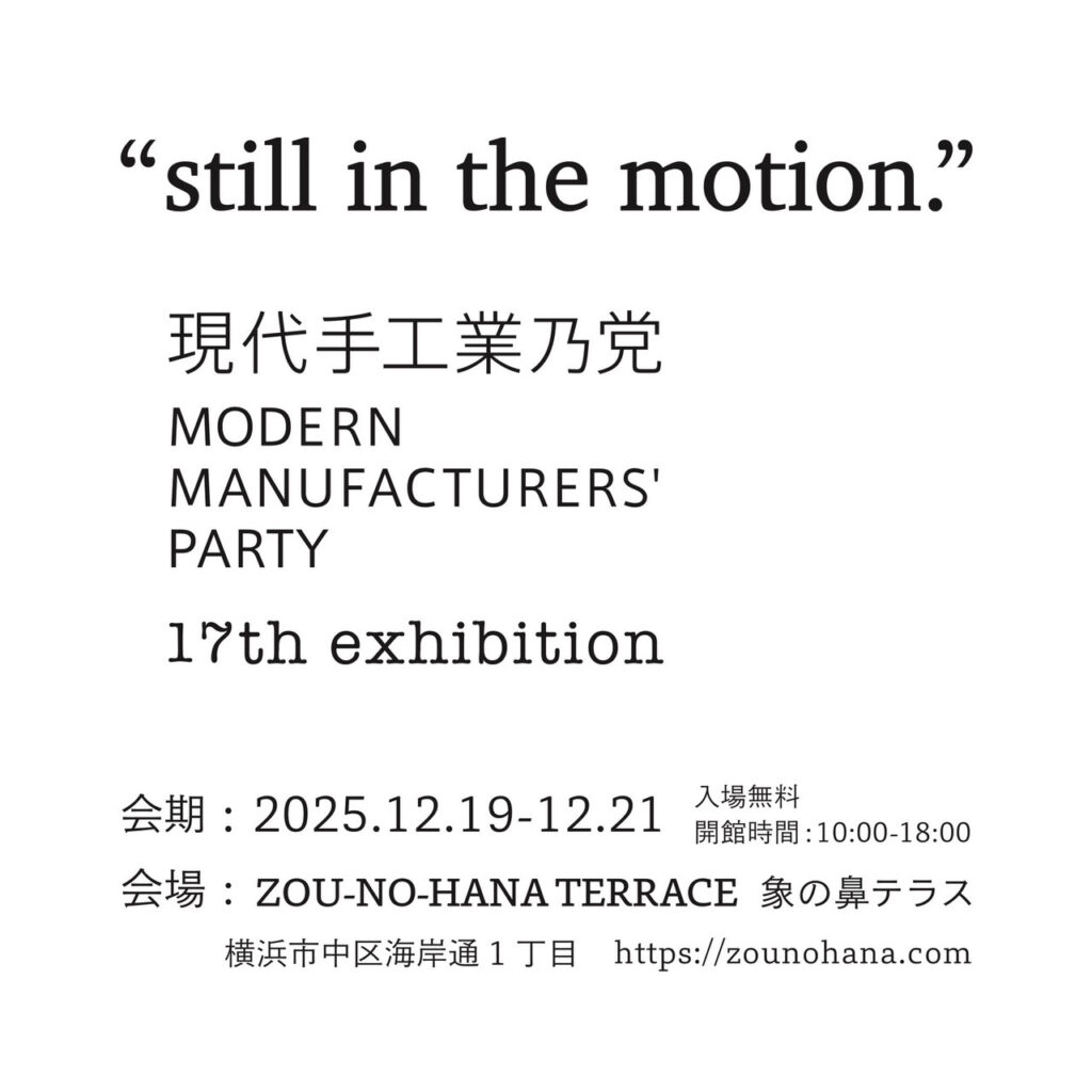 出展のお知らせ。 “still in the motion.” 現代手工業乃党MODERNMANUFACTURERS’PARTY17th EXHIBITION [会期]2025年12月19日(金) ~21日(日) 10:00~18:00 [会場]横浜港 象の鼻地区 象の鼻テラスURL:https://zounohana.com